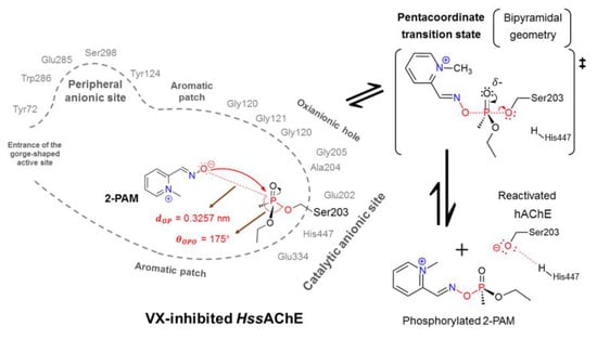 In our recent work, we presented molecular modeling studies meant to contribute to a better understanding of the reactivation mechanism of HssAChE inhibited by the nerve agent O-ethyl S-(2-(diisopropylamino)ethyl) methylphosphonothioate (VX) [20]. In that case, classical molecular-dynamics (MD) simulations were performed, considering the near attack conformation (NAC) approach [20,21,22], on a model of HssAChE based on the experimental structure of mouse AChE (PDB code 3ZLV). As a result, a NAC frame of deprotonated-2-PAM in the CAS of VX-inhibited HssAChE was obtained [20]. The deprotonation of the aldoxime (−C=NOH) group may happen under physiologic conditions in the pathway towards the NAC [14,19,21,22,23], or before its entry into the AChE active site, according to the pKa = 7.68 of 2-PAM [24]. In our NAC, the distance between the O-atom of the aldoximate (−C=NO−) group and the P-atom of the phosphorylated Ser203 (dOP) was 3.26 Å and the attack angle amongst the O- and P-atoms of the OP and the O-atom of Ser203 (θOPO) was 175° [20]. These values, according to the NAC concept early defined by [20,21,25], resemble the bonds to be formed and broken in a pentacoordinate transition state (TS) [26,27,28] of a bimolecular nucleophile substitution (SN2) mechanism (Figure 1) [29,30,31]. Experimental data for this reaction were published before by Nepovimova et al. [32]; however, data about its energetics of reactivation are still missing.