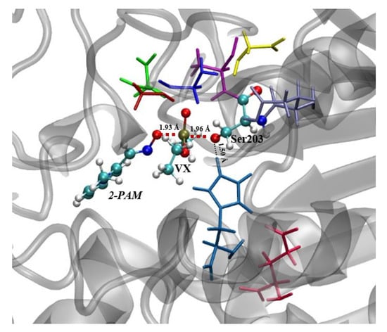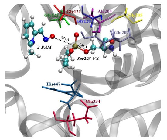 When it comes to the deprotonated 2-PAM approximation towards the P-atom of the Ser203-VX adduct, a maximum-energy structure was achieved with the QM system geometry characterized by imaginary frequency calculations, as can be seen in Figure 4. As a result, such structure was built with the OAldoximate – POP and POP – OSer203 binding lengths equal to 1.93 Å and 1.96 Å, respectively. As expected, both bond lengths (OAldoximate – POP and POP – OSer203) were such that they could hypothetically be formed and cleaved, pointing to a reactivation reaction through the SN2 mechanism. These findings suggest good agreement with the results from Driant et al. [36], who proposed that this reaction proceeds through an addition–elimination mechanism. In addition, the distance between one of the H atoms of His447 and the O-atom of Ser203 was finally 1.50 Å (Figure 4). This value shows that the His447 residue approaches considerably to stabilize Ser203 residue, which may support the formation of the products.