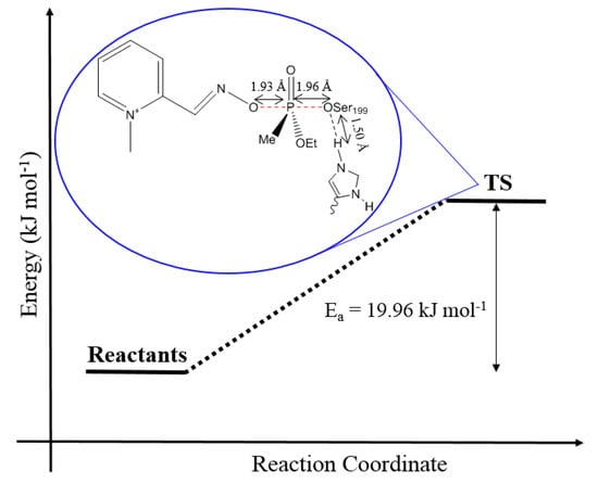 The combination of quantum mechanics (QM) and molecular mechanics (MM) techniques [33] is a valuable asset for the understanding of the enzyme reactivation mechanisms as well as to allow the modeling of larger systems, with a lower computational demand [34,35]. By performing such methodologies, Driant et al. [36] calculated the activation energy values for the reactivation reaction of VX-inhibited HssAChE by protonated 2-PAM. The authors stated that such a mechanism was of the addition–elimination type after analyzing variations in lengths regarding dOP (OAldoximate – POP) and between the central P-atom of the OP and the O-atom of Ser203 (POP – OSer203) [36]. In the present work, we took the NAC frame provided by MD simulation (Figure 1), reported before [20], to perform complementary studies regarding a comprehensive combined QM/MM methodology [36]. As a result, the theoretical efficiency of the deprotonated 2-PAM to reactivate the VX-inhibited HssAChE was confirmed. Accordingly, the TS geometry was characterized and the reactivation energy barrier to achieve it was determined, similarly to what was previously described by Driant et al. [36].