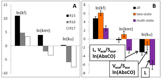 The values of structural parameters considered in this paper (L, ln(AbsCO), Vasa/Sasa and Rg) are lower for two-state proteins than for multi-state proteins: 78 ± 5 vs. 130 ± 8 for L, 3.14 ± 0.05 vs. 3.59 ± 0.06 for Vasa/Sasa, 6.91 ± 0.06 vs. 7.22 ± 0.06 for ln(AbsCO), and 12.1 ± 0.3 vs. 14.2 ± 0.3 for Rg (see Table 2). The logarithms of the folding and unfolding rates are higher for two-state proteins, in comparison with multi-state proteins: 6.08 ± 0.50 vs. 2.51 ± 0.59 for the folding rate and −1.51 ± 0.79 vs. −6.09 ± 1.03 for the unfolding rate, respectively (see Figure 1B).