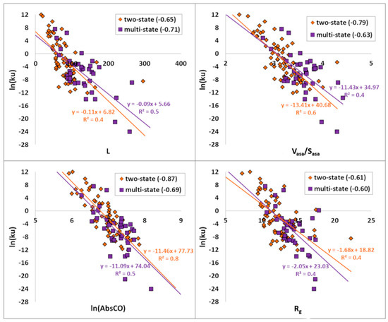 For 108 proteins, the correlations between the logarithm of the unfolding rate (ln(ku)) and structural parameters such as L, Vasa/Sasa, ln(AbsCO), and Rg were calculated (Table 3 and Figure 2). Vasa/Sasa and ln(AbsCO) are better correlated with the logarithm of the unfolding rate of two-state proteins. For two-state proteins, these correlations are −0.79 and −0.87, in comparison with −0.63 and −0.69 for multi-state proteins. The correlation between Rg and the logarithm of the unfolding rate is almost the same for two-state and multi-state proteins (−0.61 vs. −0.60, respectively). Moreover, L is better correlated with the logarithm of the unfolding rate of multi-state proteins. Good correlation (0.79) between the protein stability (−(lnkf − lnku)) and the logarithm of the unfolding rate has been observed.