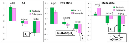 To find the dependence of the unfolding rates on the origin of the proteins, the 42 bacterial and 53 eukaryotic proteins from our database were separately studied. Two-state bacterial proteins fold and unfold faster than two-state eukaryotic proteins. For multi-state proteins, we observed that bacterial proteins fold and unfold slower than eukaryotic proteins (see Figure 3 and Figure 4). The same result was observed when the dataset consisted of 35 bacterial and 38 eukaryotic proteins [23]. The correlation between the logarithm of the unfolding and folding rates is 0.73 for bacterial and 0.75 for eukaryotic proteins. Moreover, for bacterial proteins, this correlation is better for two-state (0.69) than for multi-state proteins (0.45). For eukaryotic proteins, this correlation is better for multi-state (0.81) than for two-state proteins (0.72). Values Vasa/Sasa, ln(AbsCO), and Rg are slightly higher for the bacterial proteins, and this gap increases for multi-state proteins: 3.74 ± 0.07 vs. 3.47 ± 0.07 for Vasa/Sasa, 7.40 ± 0.07 vs. 7.14 ± 0.10 for ln(AbsCO), and 14.8 ± 0.5 vs. 13.9 ± 0.4 for Rg, respectively (Table 5).