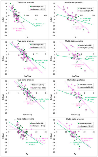 Then, we separately studied bacterial and eukaryotic proteins from our database. It has been shown that two-state bacterial proteins fold and unfold faster than two-state eukaryotic proteins, and multi-state eukaryotic proteins fold and unfold faster than multi-state bacterial proteins. The logarithm of the unfolding rate of two-state bacterial proteins correlates better with ln(AbsCO) (−0.86) and Rg (−0.64), and eukaryotic proteins correlate better with L (−0.75). For multi-state proteins, the following picture is observed: the logarithm of the unfolding rate of bacterial proteins correlates better with Rg (−0.58), and eukaryotic proteins correlate better with L (−0.77), Vasa/Sasa (−0.69), and ln(AbsCO) (−0.81).