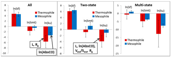 Finally, the correlations of the logarithm of the unfolding rate and structural parameters for thermophilic and mesophilic proteins were examined (Table 8 and Figure 8). L and Rg correlate better with the logarithm of the unfolding rate of all thermophilic proteins (−0.83 vs. −0.64 for L and −0.87 vs. −0.66 for Rg), and ln(AbsCO) correlates better with the logarithm of the unfolding rate of all mesophilic proteins (−0.74 vs. −0.83). Vasa/Sasa correlates with the logarithm of the unfolding rate practically the same for all thermophilic and mesophilic proteins (−0.77 vs. −0.75). For two-state thermophilic proteins, the correlation between all considered parameters (L, Vasa/Sasa, ln(AbsCO) and Rg) is better than for two-state mesophilic proteins: −0.92 vs. −0.60 for L, −0.92 vs. −0.78 for Vasa/Sasa, −0.93 vs. −0.85 for ln(AbsCO), and −0.88 vs. −0.60 for Rg.
