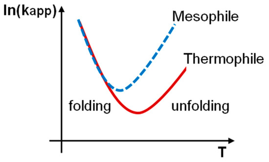 Schematic “chevron” plots of the constant of observed rate (kapp = kf + ku) versus temperature for thermophilic and mesophilic proteins.