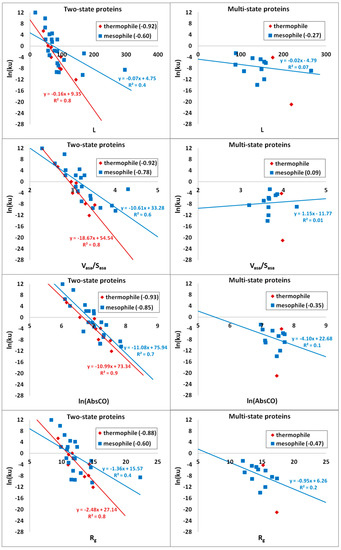 Correlations of the logarithm of the unfolding rate of the two- and multi-state thermophilic and mesophilic proteins with structural parameters: L (length of the protein), Vasa/Sasa, ln(AbsCO), and Rg. There is a line approximation of points and its equation: red line corresponds to thermophilic proteins and blue line to mesophilic proteins. R2 is a linear approximation reliability.