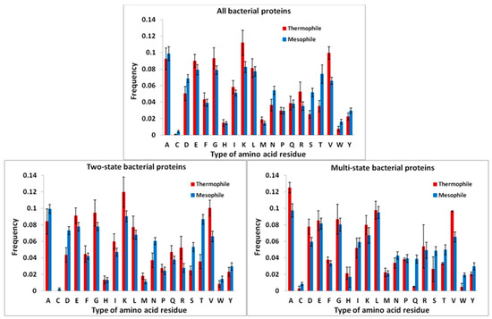 The thermophilic proteins are enriched with Lys, Arg, and Val, in comparison with the mesophilic proteins, and enriched in Lys, Asp, Ala, and the mesophilic proteins contain more Asp, Asn, Ser, and Thr, in comparison with the thermophilic proteins (Figure 9). The same can be said about two-state thermophilic and mesophilic proteins. These data are also consistent with those that we obtained earlier in the study of 373 pairs of structurally similar thermophilic and mesophilic proteins [27].
