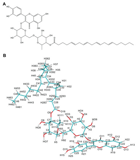 Rutin arachidonate (A) 2D structure; (B) atom names. Panels (A) and (B) were rendered using ChemDraw and YASARA [42] programs.