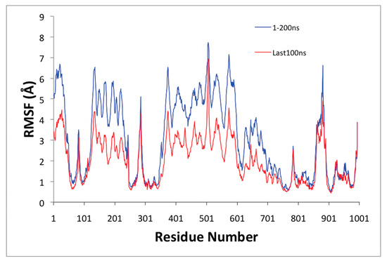 Root–mean–squared fluctuations (RMSF) values collected from the starting structure during the whole (blue) and the last 100 ns (red) molecular dynamics (MD) simulation.