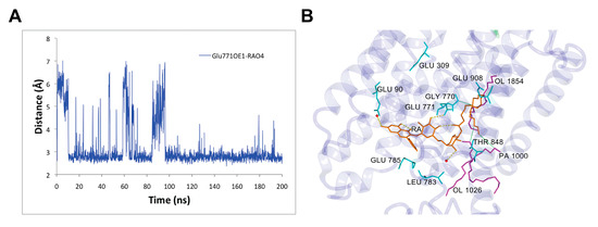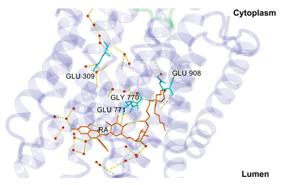 The first proton transport to the cytoplasm region occurred by means of Glu309 [39,41]. Under the presence of RA, the value of pKa for Glu309 decreased from 9.04 to 7.31 after 200 ns of simulation. However, its average value for the whole 200 ns MD simulation (7.85 ± 0.77) was slightly higher compared to the second half of the MD simulation, which was 7.50 ± 0.34. Thus, the probability of the first proton transport was lower when compared with unsubstituted SERCA1a [39]. Moreover, according to our computational results, the second proton transport, which came from Glu771, was improbable. During the simulation time, the orientation of the side-chain carboxyl group of Glu771, which was a source of the second proton transfer, changed considerably and turned towards the RA molecule (see Figure 8) creating a stable hydrogen bond with it (see Figure 6 and Figure 8). Concurrently, under the changed surrounding conditions after 200 ns of MD, the pKa value of Glu771 increased from 8.35 to 8.58. The average value for the whole MD simulation was 8.65 ± 0.51, and for the second half (100 ns–200 ns) was 8.41 ± 0.22. The third titrable residue, Glu908, increased its pKa value from 10.89 to 11.71. The average value for the whole MD simulation was 10.59 ± 1.76, similar to that for the second half of the simulation (10.70 ± 1.87). Residue Glu908 is supposed to stay protonated even in the Ca2+-bound-E1 state [39,41]. However, this state depends strongly on the protonation of Asp800 [39]. The protonation of Asp800 immediately invokes the deprotonation of Glu908 (see Table 1 in [39]). During our simulation, the pKa of Asp800 reached basic values in two cases (10.48 at 10 ns and 11.06 at 140 ns), causing a strong jump shift of the pKa of Glu908 to respective acidic values (5.38 at 10 ns and 5.63 at 140 ns). The protonation of proteins is a very complex process depending on a variety of factors. We were not able to include all of them in our study, but it is also obvious that RA induces reasonable changes in the SERCA1a protonation state.