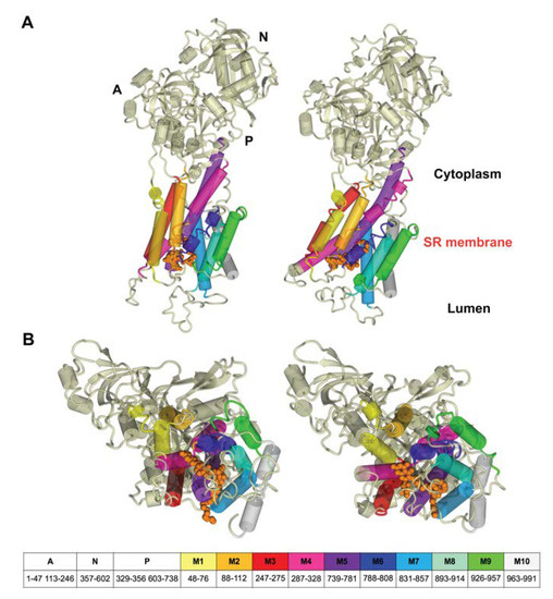 Rearrangement of transmembrane regions M1-M10 during the MD simulation: (A) side view; (B) view from the lumen. Structures at the beginning (left panel) and after 200 ns MD simulation (right panel). The cytoplasm domains (A, N, and P) and the transmembrane helices (M1 to M10) legend and residue numbering are shown at the bottom. The residues not assigned to domains are loops between individual transmembrane helices occurring in the lumen. Rutin arachidonate is depicted as a space-filling model in orange. Figures were rendered using YASARA [42].