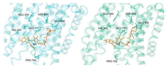 Conformation of RA (orange) and the nearby residues at the beginning (left panel; cyan) and after 200 ns (right panel; green) MD simulation. Hydrogen bonds are displayed as yellow dashed lines. An inward-to-outward carboxyl group side-chain transition of Glu309 during the MD simulation can also be seen. Figures rendered using YASARA [42].