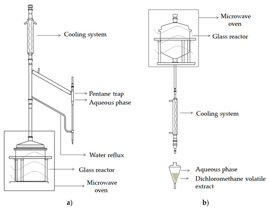 Scheme of the apparatus for microwave-assisted isolation. (a) Microwave-assisted distillation (MAD); (b) microwave hydrodiffusion and gravity (MHG).