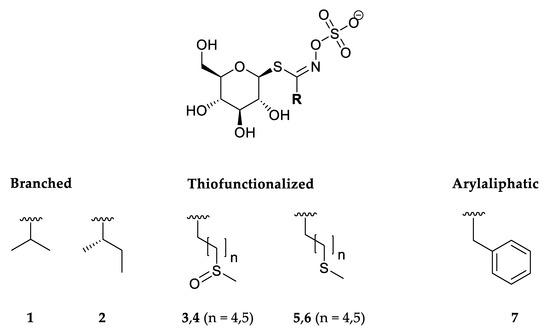 Seven GSLs were detected by UHPLC-DAD-MS/MS analyses. The structures of the corresponding GSLs are shown in Figure 2.
