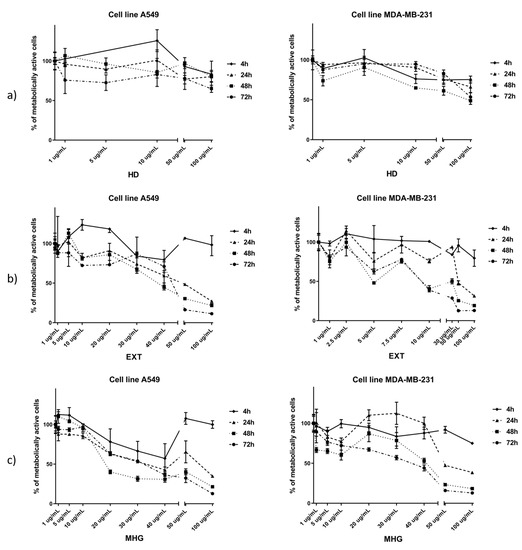 When tested against the MDA-MB-231 cell line, the best cytotoxic activities were shown after 72 h. EXT showed to be highly active with IC50 11.27, while MHG showed 2.3-fold lower activity, having IC50 25.83 μg/mL.