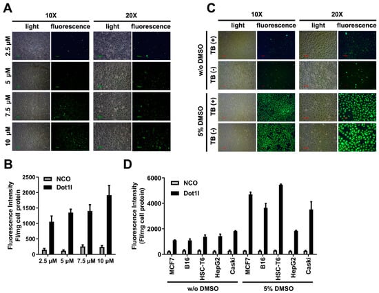 Figure 2. Fluorescence labelled Dot1l peptide penetration in cultured cells. (A) Fluorescence microscopy of fluorescein isothiocyanate (FITC)-labeled Dot1l peptide with different concentrations. (B) Quantization analysis of FITC-labeled Dot1l peptide corresponding to fluorescence microscopy with different concentration measurements. The statistical analysis is shown in Supplementary Figure S1A. (C) Fluorescence microscopy of FITC-labeled Dot1l peptide with or without trypan blue incubation in the DMSO-pretreated or control group. (D) FITC-labeled Dot1l peptide penetration in different cell lines (MCF7, B16, HSC-T6, Caski, and HepG2) with or without DMSO pretreatment. The statistical analysis is shown in Supplementary Figure S1B,C. Cell lysate fluorescence intensity was adjusted by protein concentration examined by Bradford assay.
