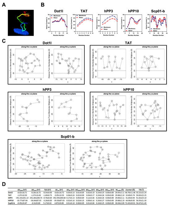 To further investigate the penetration of Dot1l peptide, the interaction between Dot1l peptide and membrane was predicted using PPM web server and MCPep server. As our previous paper has shown, well-known CPP-TAT [9], hPP3 [19], and hPP10 [20,26] can partially be inserted into the membrane predicted by the PPM web server [27], similar to Dot1l peptide’s weak property of membrane insertion (Figure 4A). The MCPep server, a computational tool for the prediction of peptide (secondary structure) occurrence in lipid bilayers and aqueous environments, was used for further prediction of interactions between Dot1l peptide and membrane. Dot1l, hPP10, and Scp01-b presented α-helical conformations in both lipid bilayers and aqueous environments (Figure 4B) while TAT and hPP3 tended to acquire a random coil conformation. However, in membranes, unlike Dot1l, hPP10, and Scp01-b, TAT and hPP3 tend to form α-helical conformations. The simulation predicts weak membrane association without any insertion for Dot1l peptide (Figure 4C). Additionally, thermodynamic characteristics for Dot1l, hPP10, Scp01-b, TAT, and hPP3 in surface configurations (Figure 4D and Supplementary Figure S3) suggested that Dot1l peptide interacted with membranes but could not enter into the membrane stably.
