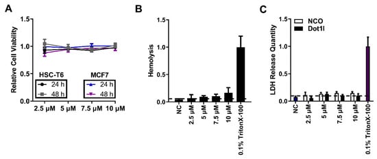 Figure 5. Cytotoxicity evaluation on Dot1l peptide. (A) Cell viability of HSC-T6 and MCF7 cells treated with Dot1l peptide at indicated concentrations examined after 24 and 48 h by MTT assay. Data are presented as means ± SEM (n = 3), p > 0.05, two-way analysis of variance (ANOVA) with Bonferroni’s multiple comparison test. (B) Cell membrane integrity examined by hemolysis assay after different concentrations of Dot1l peptide treatment; 0.1% Triton X-100 used as positive control. Data are presented as means ± SEM (n = 3). Groups (2.5 µM, 5 µM, 7.5 µM and 10 µM ) were compared with negative control (NC) control, p > 0.05, one-way ANOVA with Tukey’s multiple comparisons test. (C) LDH release quantity assay in HSC-T6 cells treated with Dot1l at different concentrations; 0.1% TritonX-100 was used as positive control. Data are presented as means ± SEM (n = 3). Groups (2.5 µM, 5 µM, 7.5 µM and 10 µM) were compared with NC control, p > 0.05, one-way ANOVA with Tukey’s multiple comparisons test.