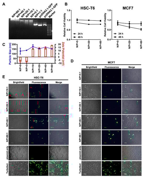 Figure 6. Dot1l-mediated plasmid delivery. (A) Gel retardation assay on different N/P ratios of Dot1l peptide and pcDNA3.1-GFP. (B) Cell viability of HSC-T6 and MCF7 cells treated with Dot1l peptide and pDNA examined by MTT assay. Data are presented as means ± SEM (n = 3), p > 0.05, two-way analysis of variance (ANOVA) with Bonferroni’s multiple comparison test. (C) Zeta-potentials and average particle size of Dot1l/pDNA complexes at various N/P ratios. Blue line indicates particle size; red bar indicates zeta potential. (D) Fluorescence microscopy of GFP expression in MCF7 cell transfected by Dot1l/pDNA complex at various N/P ratios after 24 h. (E) Fluorescence microscopy of GFP expression in HSC-T6 cell transfected by Dot1l/pDNA complex at various N/P ratios after 24 h.