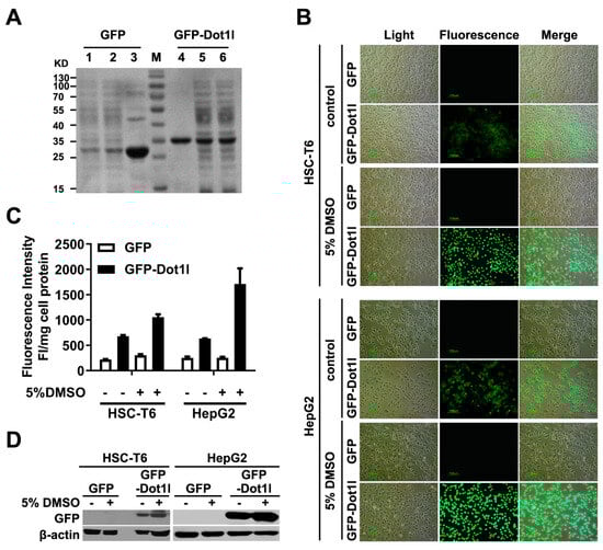 Figure 7. (A) Coomassie Brilliant Blue-stained SDS-PAGE of GFP-Dot1l fusion protein produced by recombinant prokaryotic expression system. Lanes 1 and 6 indicate no isopropyl-β-D-thiogalactopyranoside (IPTG) induction, lanes 2 and 5 indicate IPTG induction, lanes 3 and 4 indicate purified protein. (B) Fluorescence microscopy of purified GFP and GFP-Dot1l protein delivery in HSC-T6 and HepG2 cells with or without DMSO pretreatment. (C) Fluorescence intensity quantification of purified GFP and GFP-Dot1l protein in the cytosol. The statistical analysis is shown in Supplementary Figure S1F (top panel indicates HSC-T6, bottom panel indicates HepG2). (D) GFP and GFP-Dot1l protein in the cytosol of HSC-T6 and HepG2 cells examined by Western blotting; anti-GFP antibody was used to detect the protein. Cell lysate fluorescence intensity was adjusted by protein concentration examined by bicinchoninic acid (BCA) assays.