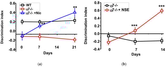 - Origlia, N.; Valenzano, D.R.; Moretti, M.; Gotti, C.; Domenici, L. Visual acuity is reduced in alpha7nicotinic receptorknockout mice. Investig. Ophthalmol. Vis. Sci. 2012, 53, 1211–1218. [Google Scholar] [CrossRef][Green Version]