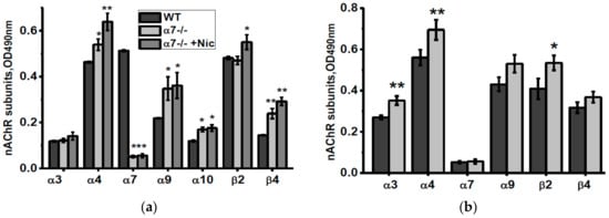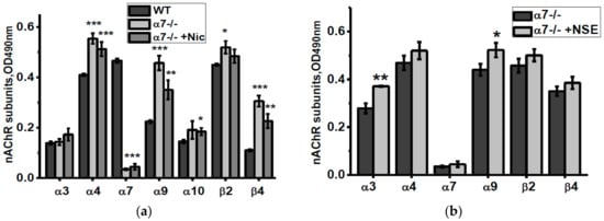 - Lykhmus, O.; Voytenko, L.; Lips, K.S.; Bergen, I.; Krasteva-Christ, G.; Vetter, D.E.; Kummer, W.; Skok, M. Nicotinic acetylcholine receptor α9 and α10 subunits are expressed in the brain of mice. Front. Cell. Neurosci. 2017, 11, 282. [Google Scholar] [CrossRef]