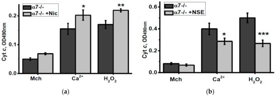 - Gergalova, G.L.; Lykhmus, O.Y.; Kalashnyk, O.M.; Koval, L.M.; Chernyshov, V.O.; Kryukova, E.A.; Tsetlin, V.I.; Komisarenko, S.V.; Skok, M.V. Mitochondria express α7 nicotinic acetylcholine receptors to regulate Ca2+ accumulation and cytochrome c release: Study on isolated mitochondria. PLoS ONE 2012, 7, e31361. [Google Scholar] [CrossRef]