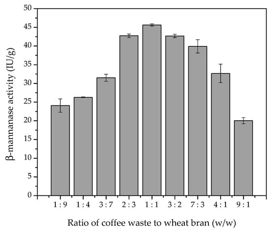 Effect of the ratio of coffee waste to wheat bran on the production of β-mannanase by A. niger F12 under SSF, at an initial moisture content of 50% (v/w), pH 5.0, and 30 °C.