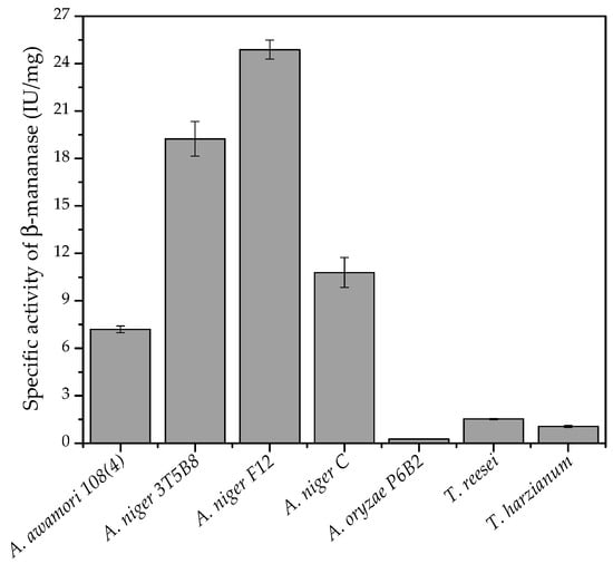 Specific activities of β-mannanase after SSF with different fungi for 120 h at 30 °C, pH 5.0, and 50% (v/w) moisture content.