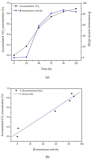 In SSF, the microbial biomass grows entangled in the solid substrate, which makes direct measurement of the microbial biomass concentration almost impossible. An indirect way to estimate fungal growth in SSF is by monitoring the behavior of respiratory gases (either the oxygen consumed or the CO2 produced by metabolism) []. A comparison of the β-mannanase produced and the CO2 accumulated during cultivation of A. niger F12 using an inlet air relative humidity of 80% and an air flow rate of 20 mL/min is presented in Figure 3.