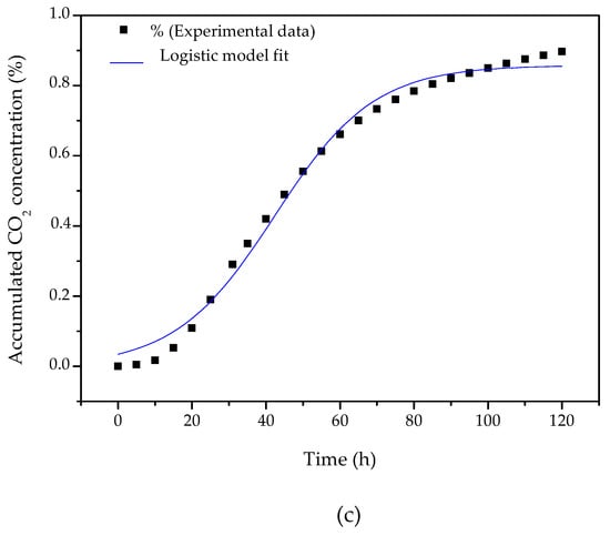 When all conditions are optimal for growth, μ = μmax (maximum specific growth rate). Fitting Equation (3) to the full curve of the experimental data for the accumulated CO2 concentration resulted in μmax = 0.075 (± 0.004) h−1 (R² = 0.992, Figure 3c) for the bioprocess studied here. It should be noted that this parameter is specific for each combination of microorganism, substrate, and product, hence requiring specific experimental measurements of growth in the system of interest.
