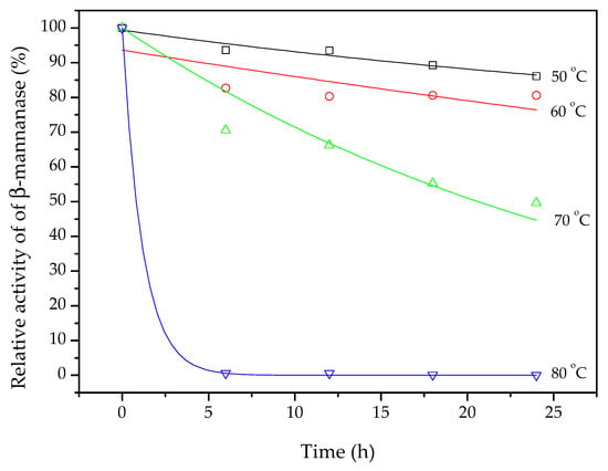 Thermostability of β-mannanase during 24 h at 50, 60, 70, and 80 °C. The symbols are the experimental data and the lines are exponential decay curve fits.