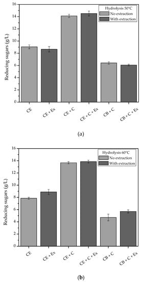 Concentrations of reducing sugars released from coffee residue using the crude enzyme extract produced here, with and without a commercial enzymatic cocktail, at (a) 50 °C and (b) 60 °C. Hydrolysis conditions: 30 rpm for 24 h at 20% (w/v) solids loading, with or without a thermal extraction period. CE: crude extract (enzymes produced in this work); Ex: 15 min extraction; C: Cellic CTec3 (5 FPU/g); CB: 50 mM sodium citrate buffer (pH 5.3).