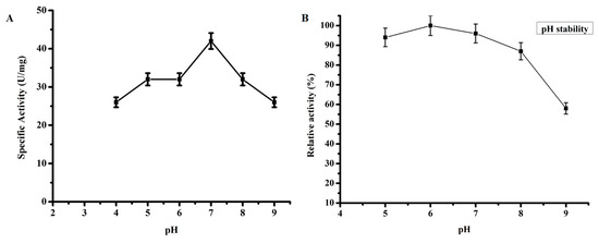 TmPLB1 showed optimum pH at 7.0 (Figure 2A) and has high activity at this neutral pH. It retained about 25–30% specific activity at pH 8.0 and 9.0. In order to investigate pH stability, (Figure 2B) the enzyme was incubated for 12 h with a pH ranges 5.0–9.0 at 4 °C. TmPLB1 had more than 90% of the enzyme activity at pH 6.0. The enzyme activity declined quickly at pH 9.0 with only 60% of relative activity, respectively.
