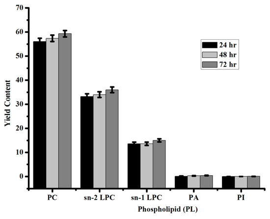 Analysis of the enzymatic hydrolysis of phospholipase B using Lecithin (Soybean) by 31P NMR. The experiment was done in triplicate at three different time intervals. The error bar represents the mean SD± of the experiment (n = 3).
