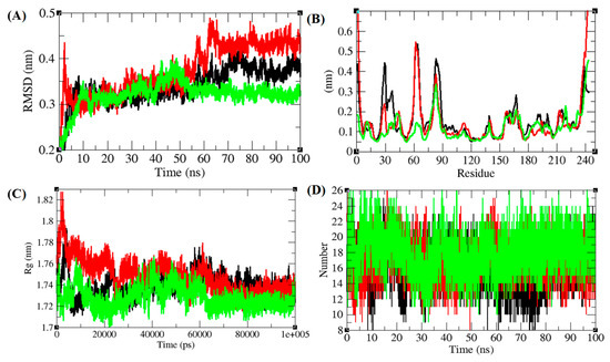 The structure nonconformities and residual variations of TmPLB1. (A) RMSD (Root mean square deviation) of TmPLB1 respect with time. (B) The backbone residues fluctuations (RMSF) of TmPLB1. (C) Radius of gyration (Rg) calculated the compactness of TmPLB1. (D) H-bonds shown amongst main chain plus side chain of TmPLB1. The black, red and green colors were representing the respective temperatures at 30 °C, 35 °C, and 40 °C, respectively.