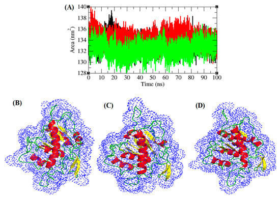 SASA (Solvent Accessible Surface Area) of TmPLB1. (A) SASA of TmPLB1 were represent in cartoon model (B) 30 °C, (C) 35 °C, and (D) 40 °C, respectively. Black, red, and green colors were depicted the 30 °C, 35 °C, and 40 °C, respectively.