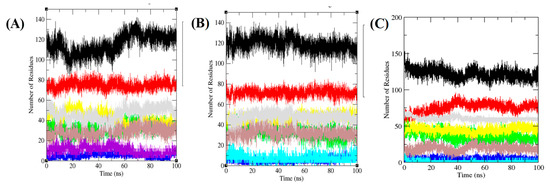 Secondary structure plot. Graphical representation indicating the structural elements present in the TmPLB1 during 100 ns MD simulations at (A) 30 °C, (B) 35 °C, and (C) 40 °C, respectively. The structure represents α-helices, β-sheets, β-bridge and turns. The black, red, green, blue, yellow, brown, grey, and violet color represent overall structure, coil, β-sheet, β-bridge, bend, turn, α-helix, and 3-helix, respectively.