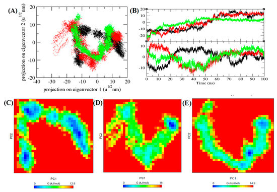 Motion of the protein during the course of simulation is shown by principal component analysis (PCA) [60]. Considering the backbone as reference the dynamics of TmPLB1 was calculated using gmx covar function integrated in GROMACS. Average proteins motion were obtained as PCs (PC1, PC2, and PC3) [61]. Addition of eigenvalues is a total motility in the system to link the flexibility of a protein below dissimilar environments. Eigenvalues and eigenvectors for TmPLB1 at 30 °C, 35 °C, and 40 °C were 323.02 nm2, 326.21 nm2, and 171.25 nm2 were calculated. Eigenvalues for TmPLB1 at 40 °C was found to be very low as compared to other temperatures. This might be the possibility of low activity of TmPLB1 at 40 °C. Further, the projections of trajectories on eigenvectors displayed differences in the position of atoms at different temperatures during the MD simulations (Figure 9A,B).