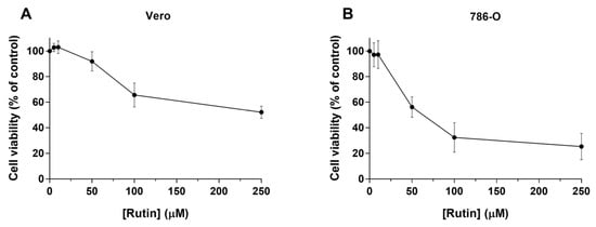 Cytotoxic effects of rutin (0–250 µM; 48 h) in Vero (A) and 786-O (B) cells. The viability of rutin-exposed cells was evaluated by MTT assay. Values represent mean ± SD (n = 6–7) and are expressed as percentages of the non-treated control cells.
