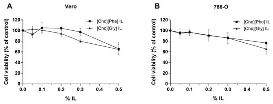 Cell viability of Vero (A) and 786-O (B) cells exposed to choline-amino acid ILs (0%–0.5%, v/v). The cell viability of ILs-exposed cells (48 h) was evaluated by MTT assay. Values represent mean ± SD (n = 2–5) and are expressed as percentages of the non-treated control cells.