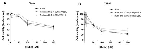 Cytotoxic effects of rutin (0–250 µM) individually and in combination with 0.3% of [Cho][Phe] or 0.2% of [Cho][Gly] ILs in Vero (A) and 786-O (B) cells. The cell viability was evaluated by MTT assay (48 h). Values represent mean ± SD (n = 3–7) and are expressed as percentages of the non-treated control cells.