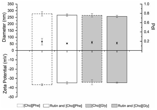 The AE and the LC of the rutin loaded into the nanoparticles were also evaluated. The AE of rutin in the delivery systems were 84.5% ± 0.3%, in the presence of [Cho][Phe], and 84.7% ± 0.3%, with [Cho][Gly] (Table 2). The LC values were also similar for both formulations (Table 2). All results showed that there are no significant differences in the AE and LC between both ILs.