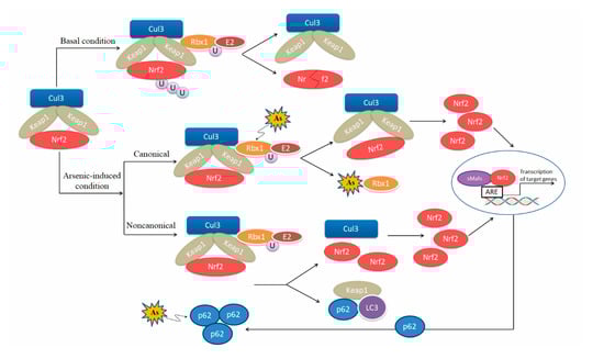 Nrf2 is a master transcription factor in antioxidant system. Under physiological conditions, the protein level of Nrf2 is low because it binds to its negative regulatory factor kelch-like epichlorohydrin-associated protein 1 (Keap1), which forms the E3 ubiquitin ligase complex and facilitates ubiquitination and subsequent degradation of Nrf2 by the 26S proteasome []. When excessive ROS are generated, certain cysteine residues (C273, C288, and C151) in Keap1 sense the stress and are S-alkylated [,], leading to impairment of Keap1-mediated Nrf2 degradation []. Nrf2 then accumulates in the cytoplasm, translocates in the nucleus, dimerizes with small musculo-aponeurotic fibrosarcoma (Maf) proteins, and binds to the ARE motif in the promotor region of target genes, including various antioxidant enzymes and detoxification enzymes [,,]. Therefore, the role of Nrf2-ARE pathway attracts much more attention in studies on arsenic toxicity.