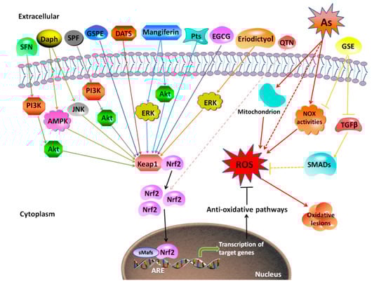 Interestingly, different natural compounds used as antioxidants exert varied roles in Nrf2 activation in reducing arsenic toxicity. For example, tetramethylpyrazine (TMP) (50 μM or 100 μM) protected against arsenic-induced nephron toxicity by inhibiting Nrf2 activation, and accordingly reducing Heme oxygenase-1 (HO-1) expression []. Pomegranate fruit extract (PFE) (0.2 mL of 0.2% of extract) reduced ROS generation in hepatocytes, thereby reducing arsenic-induced Nrf2 activation []. However, most antioxidants showed an effect on promoting Nrf2 activation in response to arsenic [,,,]. Dietary supplementation with SF (80 mg/kg BW) protected against arsenic-induced nephrotoxicity via the Phosphoinositide 3-kinase (PI3K)/Akt-mediated Nrf2 signaling pathway in the rat kidney []. Grape seed proanthocyanidin extract (GSPE) (10, 25, and 50 mg/L) activated Nrf2 signaling pathway to antagonize arsenic-induced oxidative damage, promoted arsenic methylation metabolism, and relieved arsenic-induced hepatotoxicity []. Alleviated arsenic toxicity in the liver and reproductive system by eriodictyol and lutein was via activating Nrf2 signaling pathway [,]. Co-treatment of antioxidant vitamins L-ascorbic acid and α-tocopherol attenuated toxicity induced by arsenic trioxide in H9c2 cardiomyocytes through activation of Nrf2 and Bcl2 transcription factors []. In contrast, PFE (0.2 mL of 0.2% of extract) reversed arsenic-induced hepatotoxicity with reduction in arsenic-induced Nrf2 activation [], suggesting that other Nrf2-independent mechanisms are involved in attenuation of arsenic toxicity by this antioxidant.