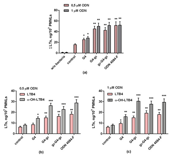 3.2. Priming with ODNs Potentiates the Synthesis of Leukotrienes during the Phagocytosis of Opsonized S. Typhimurium Bacteria by Human Neutrophils