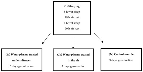 Schönfeld’s method was applied to determine the barley germination energy. Six portions of barley (500 seeds each) were placed in funnels and soaked in LPGP prepared either under nitrogen or in the air, or in non-treated water as a control. The funnels were covered with wet paper filters and Petri dishes. After 3 h, the water was drained and the seeds were left for 18 to 20 h. Then, the seeds were re-soaked in clamped funnels for 2 h. After 72 h, the non-germinated seeds were counted and soaked again in funnels for 30 min. The germination procedure was conducted for 120 h. Finally, the number of non-germinated seeds was determined [26].