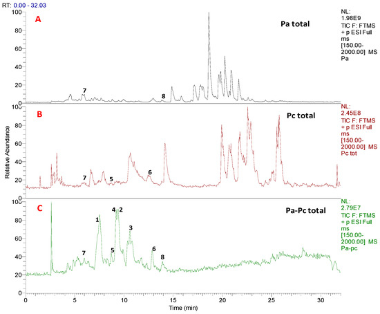 LC-MS profiles of (A) axenic Pa; (B) axenic Pc; (C) Pa-Pc co-culture indicating the isolated compounds 1–8.