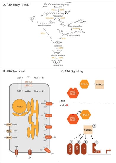 ABA is a small sequisterpene derived from carotenoids, and thus its biosynthesis begins with isoprenoids derived from the plastidic methyl-D-erythritol-4-phosphate (MEP) pathway [26]. The specific carotenoid that leads to ABA biosynthesis is zeaxanthin. The zeaxanthin epoxidase ABA Deficient 1 (ABA1) converts zeaxanthin into violaxanthin; this step is reversible and thus not a committed step in the ABA biosynthetic pathway. Zeaxanthin and violaxanthin can be converted into 9′-cis-neoxanthin and 9′-cis-violaxanthin, respectively. Conversion of 9′-cis-neoxanthin and 9′-cis-violaxanthin into xanthoxin through the 9-cis-epoxycarotenoid dioxygenase (NCED) family of enzymes represents the first committed step to ABA biosynthesis and is thought to be rate limiting [27]. Xanthoxin is converted to abscisic aldehyde through the enzymatic action of ABA Deficient 2 (ABA2) [28]. Abscisic aldehyde is used by enzymes in the Abscisic Aldehyde Oxidase (AAO) family, primarily AAO3 [29], to produce abscisic acid (Figure 2a). NCED gene transcription is differentially regulated by various stimuli, underscoring NCED roles in context-specific ABA biosynthesis. For in-depth reviews of ABA biosynthesis, please see [26,30].
