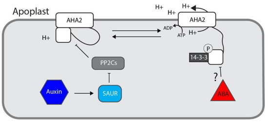 The plasma membrane H+-ATPase (PM-H+ATPase) Arabidopsis H+ATPase 2 (AHA2), ultimately regulates apoplastic pH [72] by pumping protons into the extracellular space. AHA2 activity is regulated by phosphorylation via an unknown kinase and dephosphorylation by members of the PP2C.D family of protein phosphatases. Phosphoactivation of AHA2 is dynamic and regulated by the plant hormones auxin and ABA.